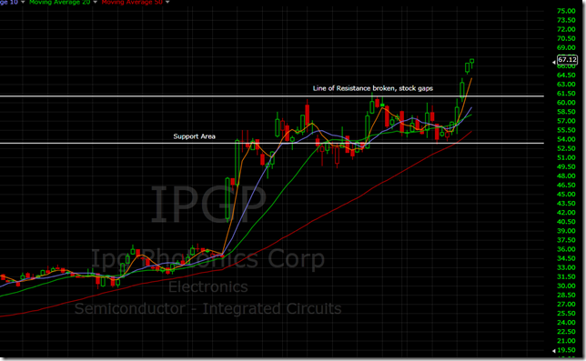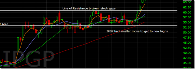 IPGP is a good example of a tight consolidation where the stock had plenty of juice to make new highs. Buying the stock as it makes the new high is the best entry point for tighter consolidations like this. Otherwise, it’s possible the stock bounces back and forth between resistance and support for the next week.