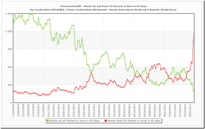 No surprise here, we had some big selling days on the daily breadth indicator. July 27th showed the first signs of trouble with 622 stocks down on our daily breadth indicator.